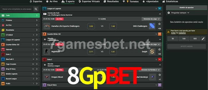 O 8Gpbet oferece uma grande seleção de opções de apostas em e-sports com probabilidades competitivas